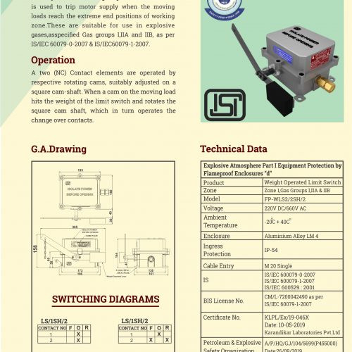 Flame Proof 40amps Counter Weight Operated Limit Switch is designed for operation in a hazardous environment where explosive gases/vapors are present. The robustly designed Flame-proof enclosure is a closed-grain aluminum casting and is vacuum impregnated. The enclosure is certified by CIMER-Dhanbad. Dhanbad for use in Gas Groups I, II, and IIB Each casting is subjected to a hydrostatic pressure test as specified in the standard,
