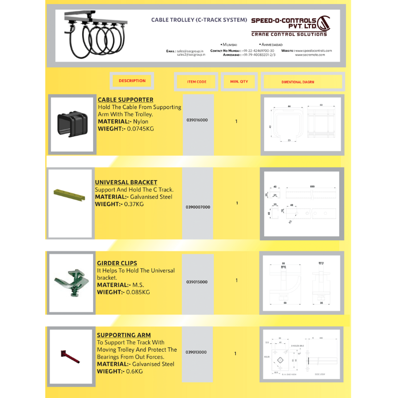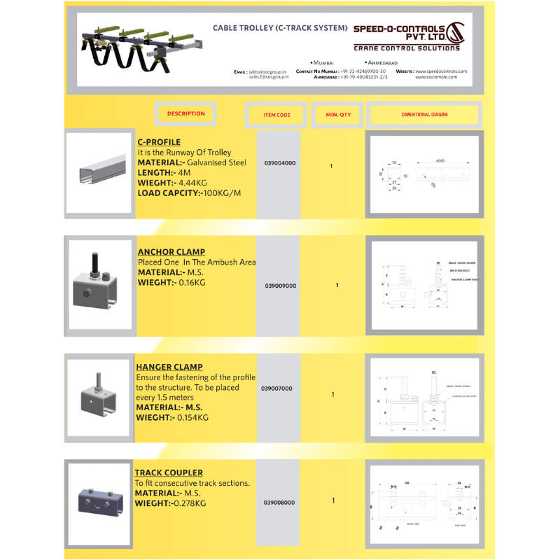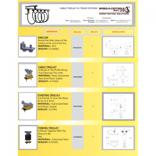 C 30 Series inclusive of C rail, Cable Trolleys, Track Coupler, Hanger Clamp, towing Trolley. Starting Trolley/Fixed Trolley, End Stop, Towing Arm & Web Bracket