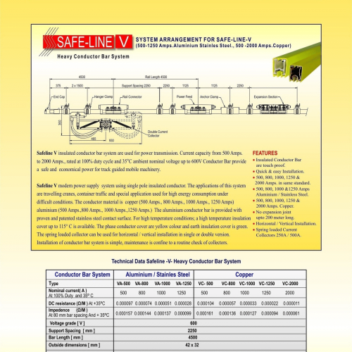 Safeline V insulated conductor bar system is used for power transmission. Current capacity from 500 Amp to 2000 Amps, rated at 100% duty cycle and 35°C ambient nominal voltage up to 600V Conductor Bar provide safe and chemical power for track guided mobile machinery
