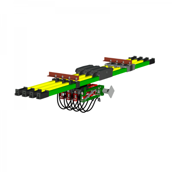 Safeline V modem power supply system using a single-pole insulated conductor. The applications of this system are traveling cranes, container traffic, and special application used for high energy consumption under difficult conditions. The conductor material is copper (500 Amps, 800 Amp. 1000 Amps, 1250 Amps) aluminum (500 Amps.,800 Amps, 1000 Amps, 1250 Amps) The aluminum conductor bar is provided with a proven and patented stainless steel contact surface. For high-temperature conditions, a high-temperature insulation cover up to 115°C Is available. The phase conductor cover is yellow color and the earth insulation cover is green