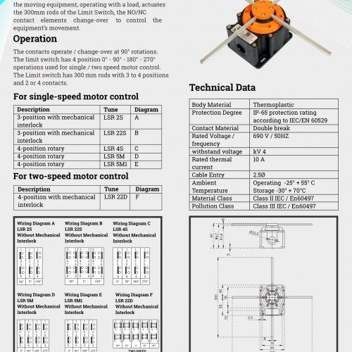 | Cross Bar Limit Switch Rotary Type | 3 position with mechanical interlock with 4 NC contacts, 4 position with mechanical interlock 4 NC contacts for slow 4 stop position, 3 position with mechanical interlock with 2 NC contacts |