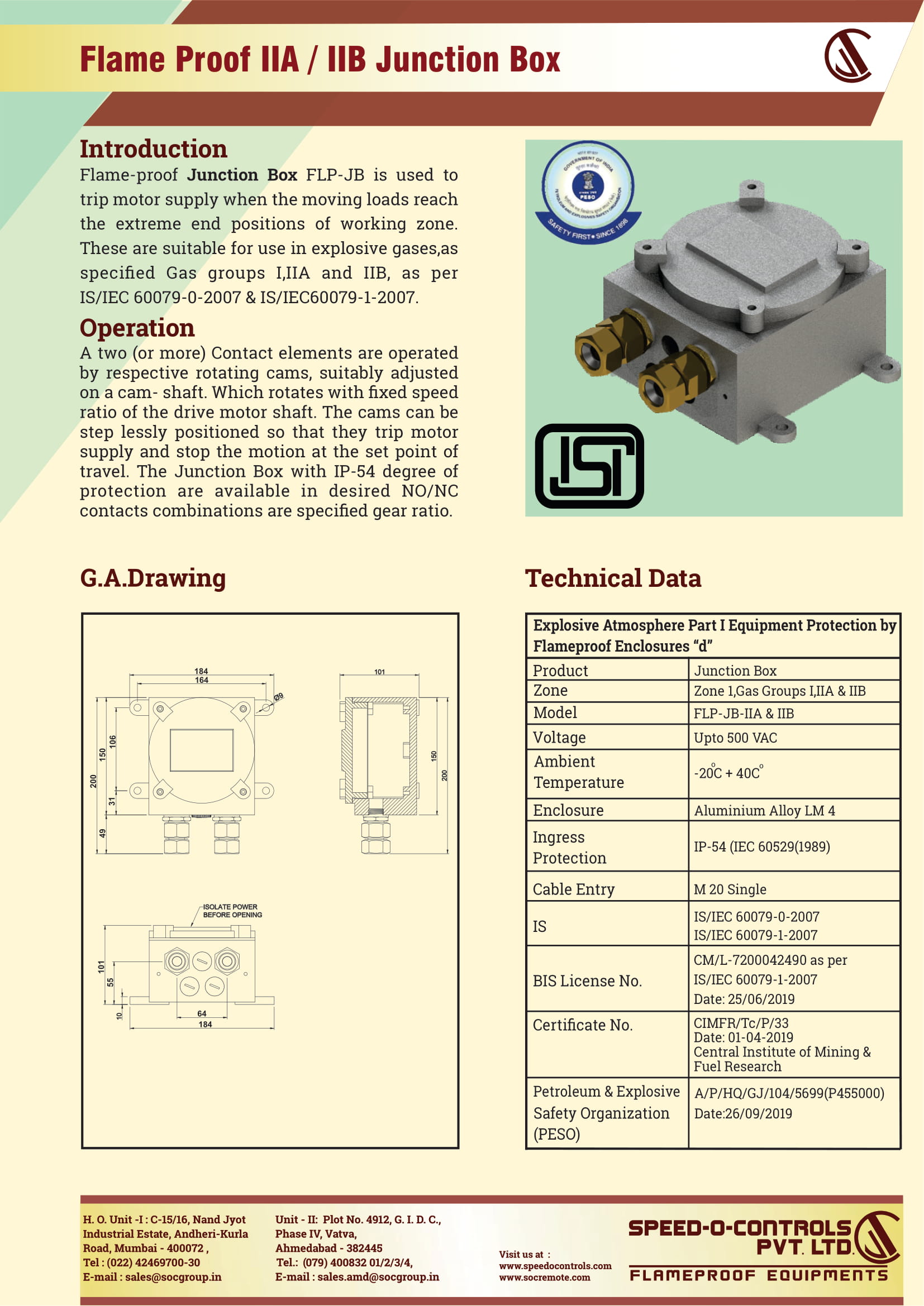 Flameproof Junction Box FLP-JB is used to trip motor supply when the moving loads reach the extreme end positions of the working zone. These are suitable for use in explosive gases, as specified Gas groups 1, 2A, and 2B, as per IS/IEC 60079-0-2007 & IS/IEC60079-1-2007.