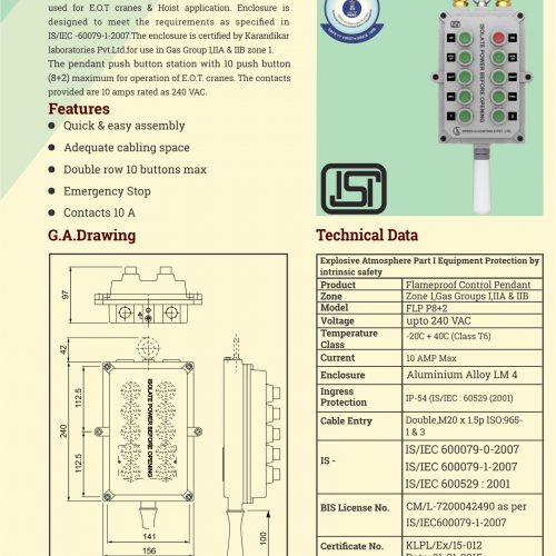 Flame Proof Pendants Push Button Station with 10 Push Button enclosure for push-button pendant station used for E.O.T cranes & Hoist application. The enclosure is designed to meet the requirements as specified in IS/IEC – 60079-1 2007. The enclosure is certified by Karandikar Laboratories Pvt.Ltd.for use in Gas Group I,2A & 2B zone 1.