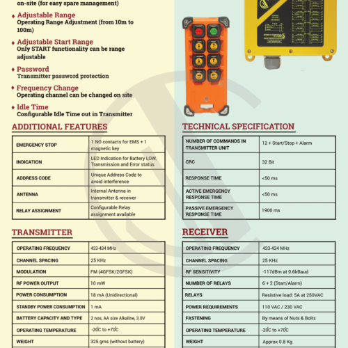 | Remote & Spares | Impact 302 Radio Remote Control System, Complete Transmitter, Transmitter Cover, Transmitter Top Housing, Transmitter Bottom Housing, Battery Cover, Magnetic Key, Membrane, Transmitter RF Card RFM (433 – 434 MHz) with Antenna, Encoder Card for Transmitter, Key Switch |