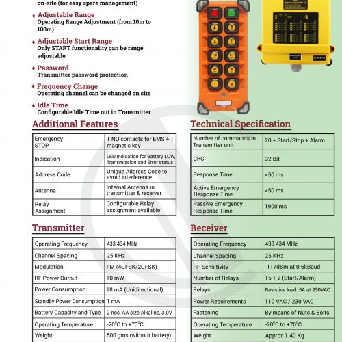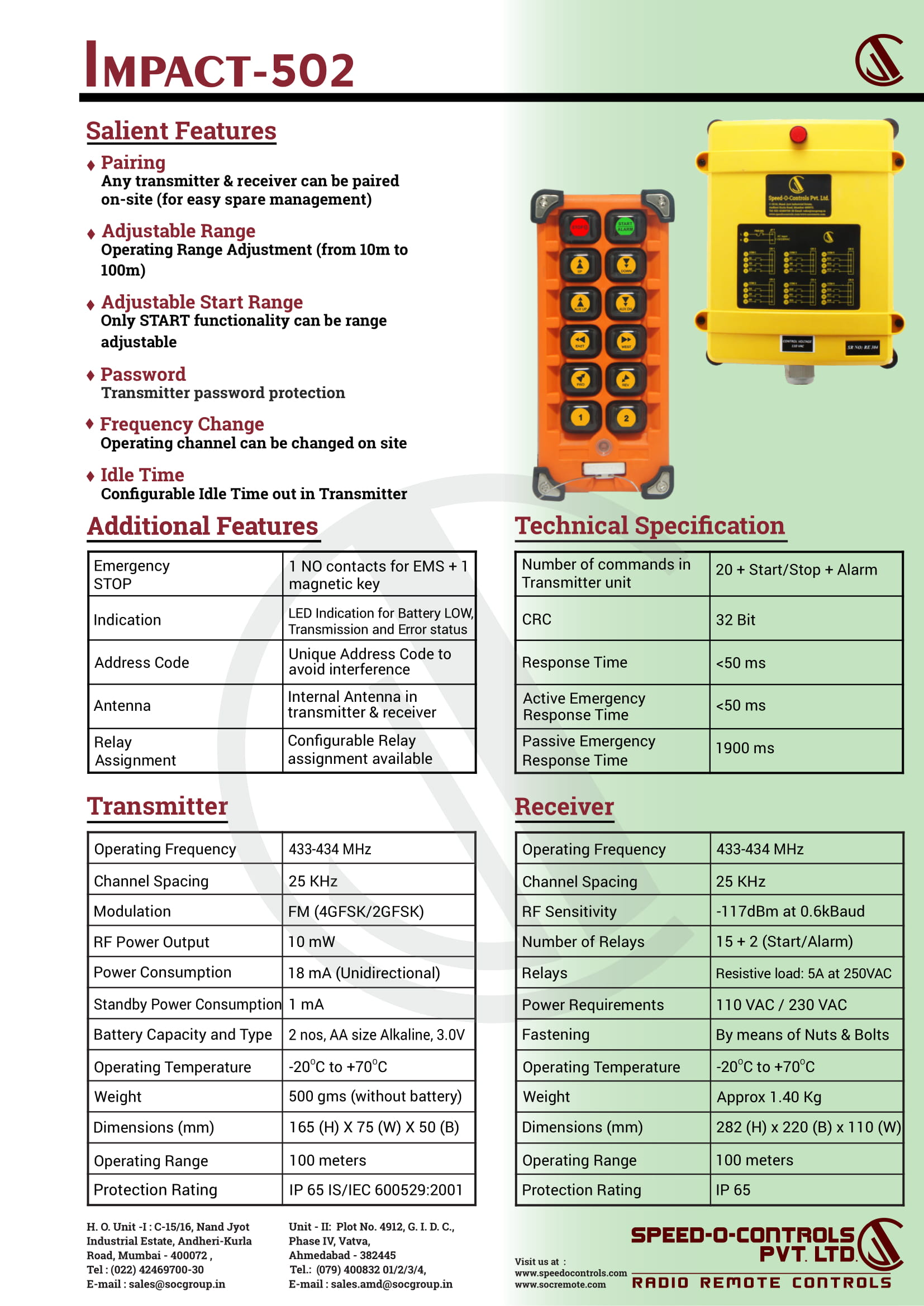 | Remote & Spares | Impact 502 Radio Remote Control System, Complete Transmitter, Transmitter Cover, Transmitter Top Housing, Transmitter Bottom Housing, Battery Cover, Magnetic Key, Membrane, Transmitter RF Card RFM (433 – 434 MHz) with Antenna, Encoder Card for Transmitter, Key Switch |