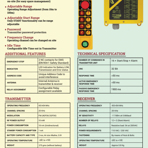 | Remote & Spares | Sky 402 Radio Remote Control System, Complete Transmitter, Transmitter Cover, Transmitter Housing, Transmitter Bottom Housing, Encoder Card for Transmitter (433MHz), Start Button Assembly, Start PCB, Push button Assembly, Emergency STOP Assembly (433), Encoder RF Card RFM (433 – 434MHz) |